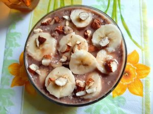 Finom kakaós zabkása, chia maggal, banánnal, kókusszal, pár szem mandulával és ízlés szerint kis fahéjjal. Előző este összeállítottam, egy éjszaka magába szívta a nedvességet, másnap reggel kész is,